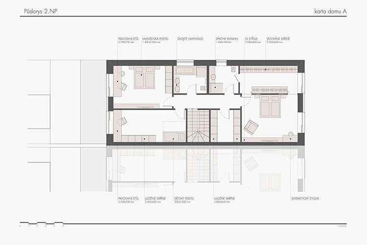 Po schodišti se dostaneme do druhého podlaží. Zde se nachází ložnice rodičů, která navazuje na vlastní šatnu a koupelnu. Díky tomuto řešení má hlavní ložnice dostatek soukromí a komfortu. Na druhé straně patra jsou dva dětské pokoje, které sdílí společnou koupelnu. Nechybí ani další samostatná místnost, kterou lze využít jako pracovnu, hernu, posilovnu nebo pokoj pro hosty.