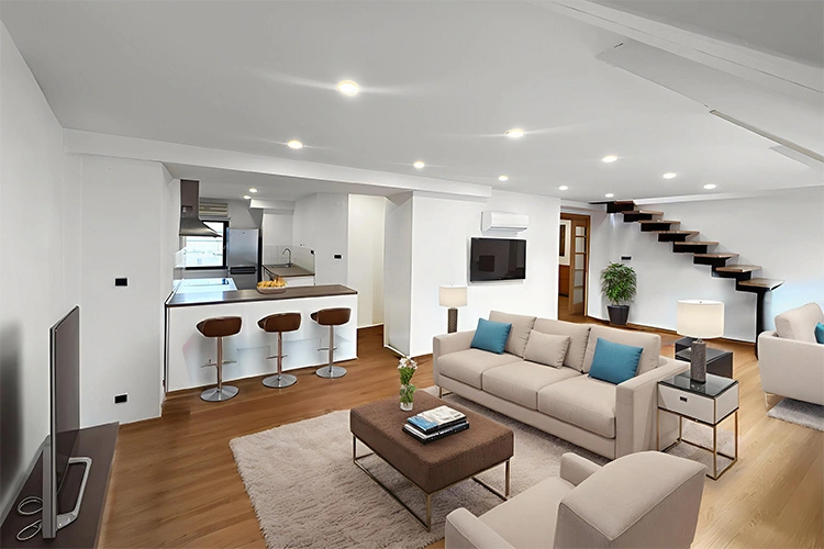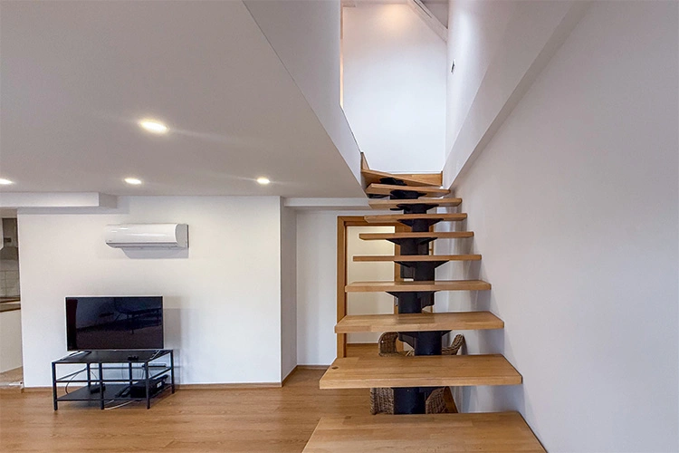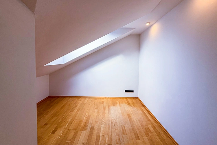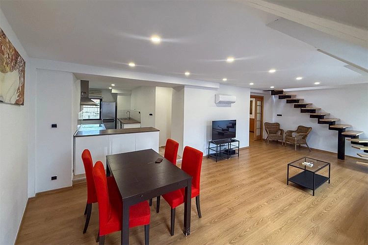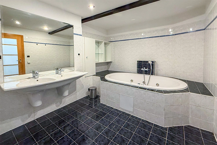 Dispozice 3+kk (mezonet) nabízí rozdělení do dvou úrovní. Spodní patro působí vzdušně a otevřeně – obývací část s jídelnou a kuchyní tvoří srdce celého bytu. Koupelna s vířivou vanou, sprchovým koutem a dvěma umyvadly potěší ty, kteří mají rádi pohodlí. V horním patře se otevírá prostor pro ložnici a pracovnu, nechybí technická místnost ani druhé WC. V celém bytě je klimatizace a zachovalé dřevěné podlahy.